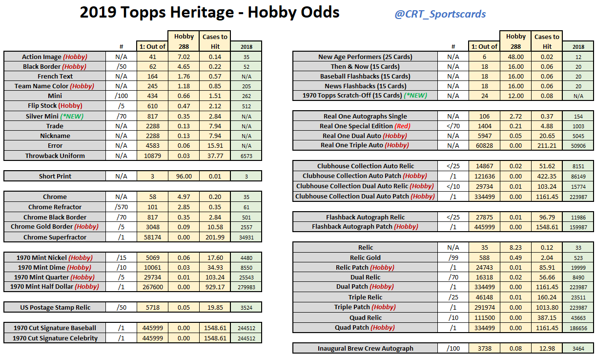 Here are the official HOBBY pack odds for 2019 Topps Heritage along with the odds from 2018 for easy comparison.